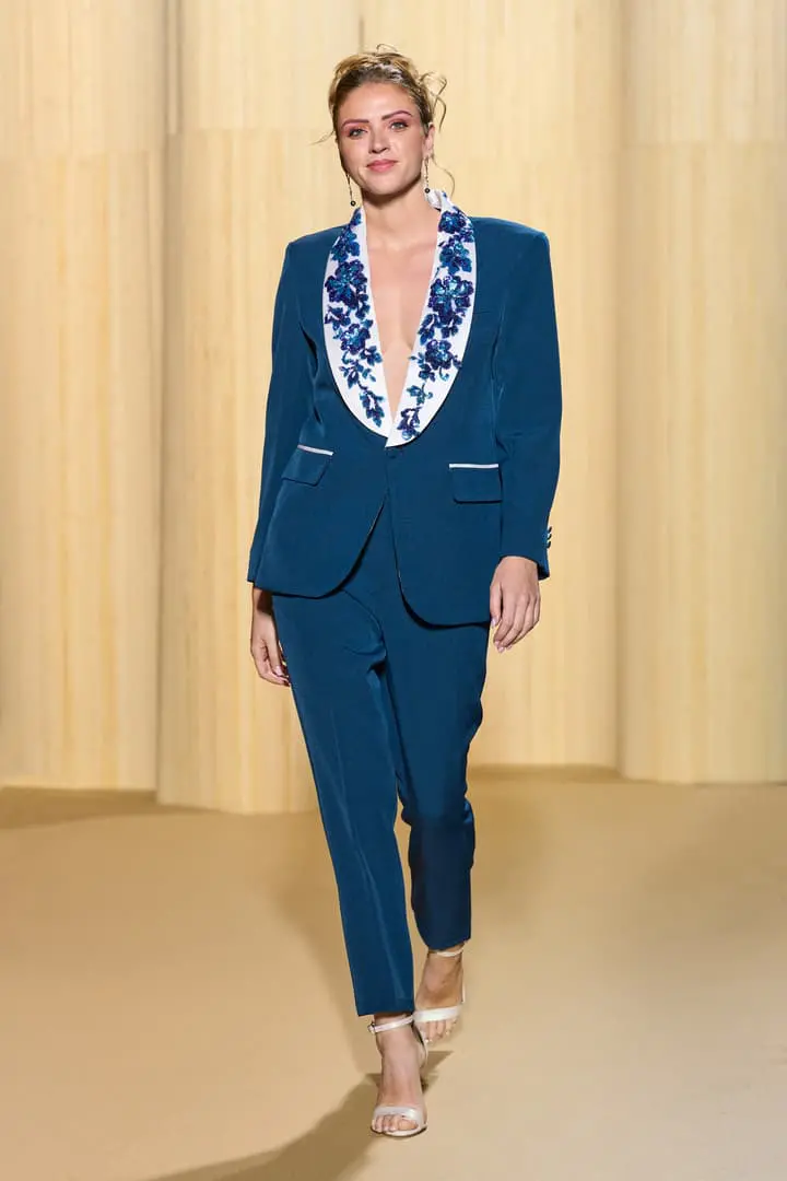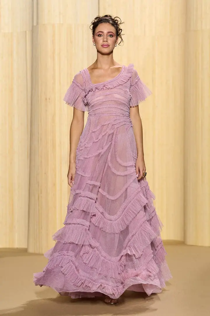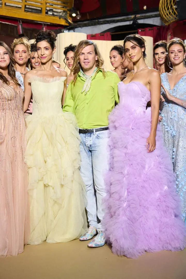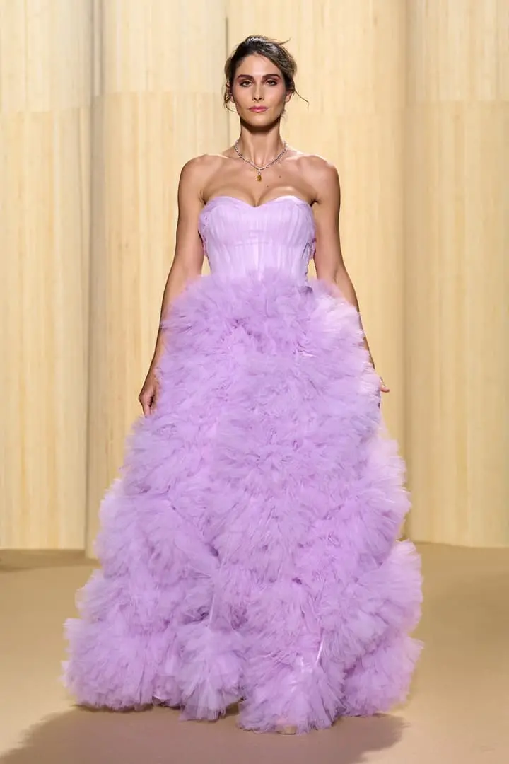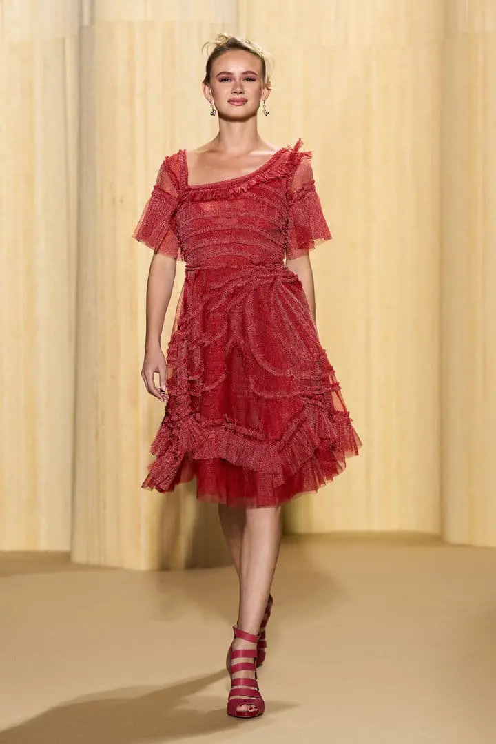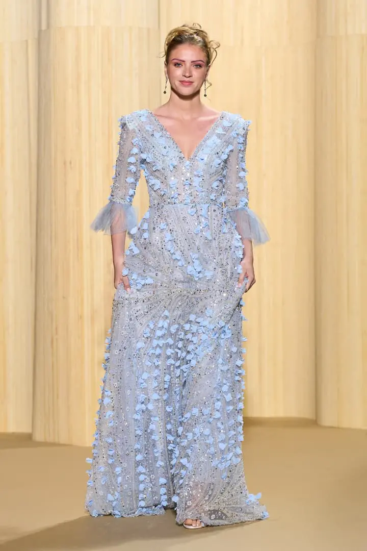Christophe propose des silhouettes affirmées 80’s, veste iconique du film au col rebrodé, jupons de tulle à volants déstructurés dans des coloris vitaminés de mauve, jaune ou rouge, robes esprit collage en jersey micro-pailleté. Tons de bleu du turquoise au bleu ciel et pétrole pour une intriguante de la nuit. Des looks débridés tendance premiers clips de MTV.