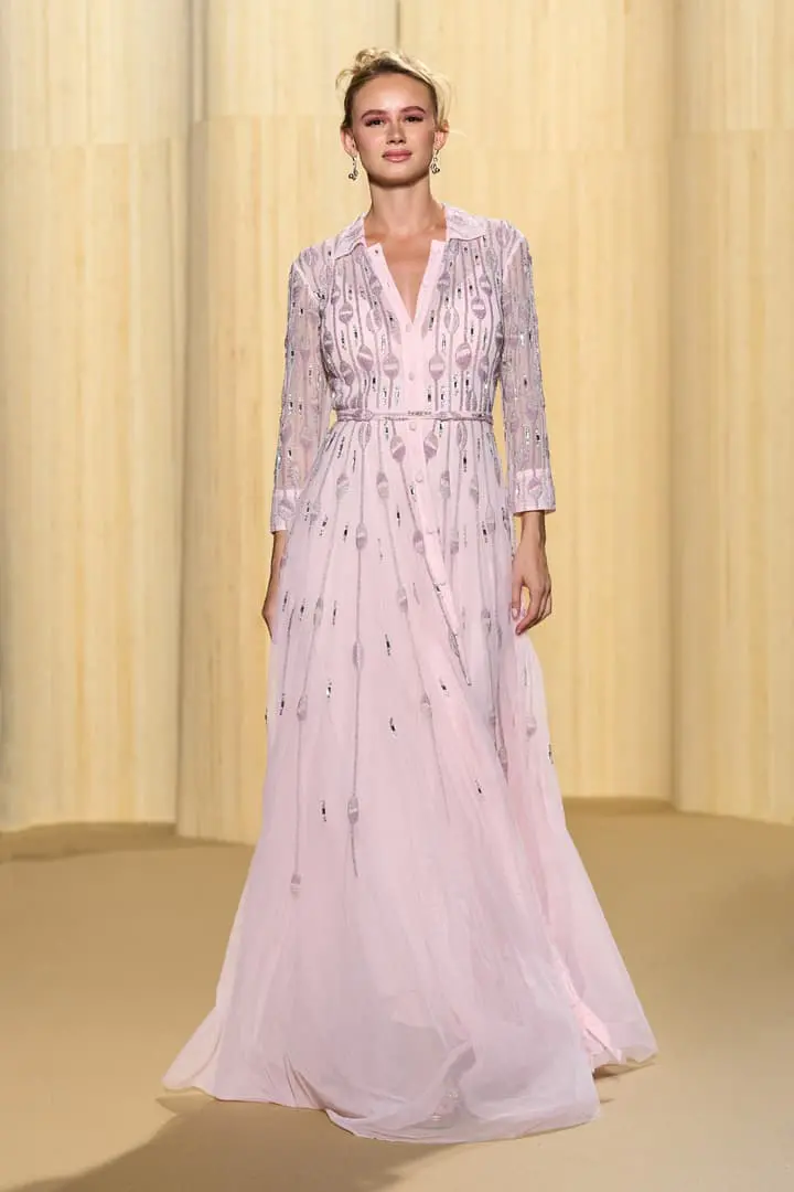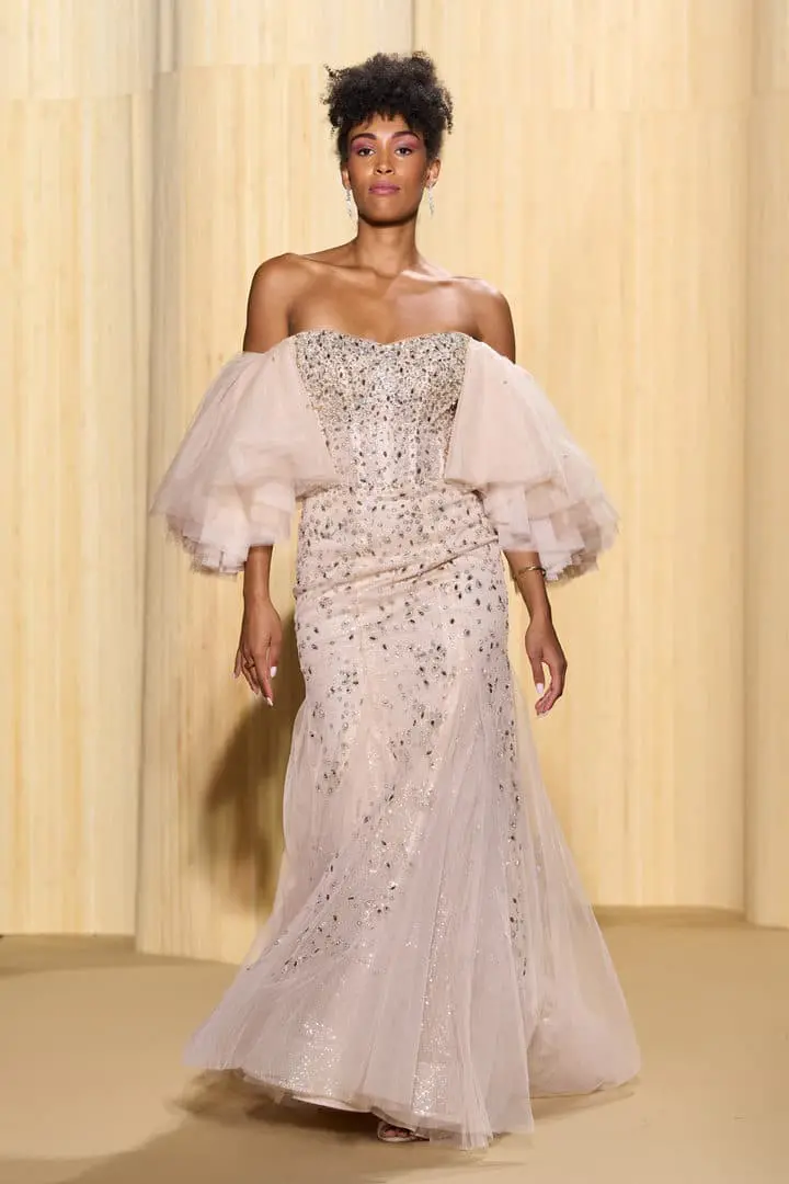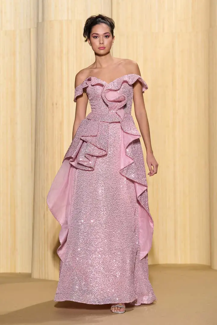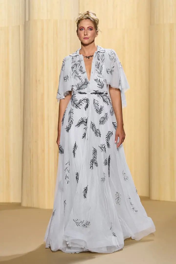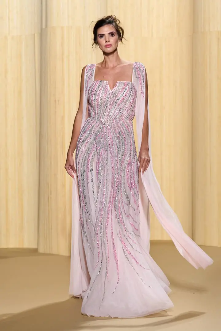 Christophe propose des silhouettes affirmées 80’s, veste iconique du film au col rebrodé, jupons de tulle à volants déstructurés dans des coloris vitaminés de mauve, jaune ou rouge, robes esprit collage en jersey micro-pailleté. Tons de bleu du turquoise au bleu ciel et pétrole pour une intriguante de la nuit. Des looks débridés tendance premiers clips de MTV.