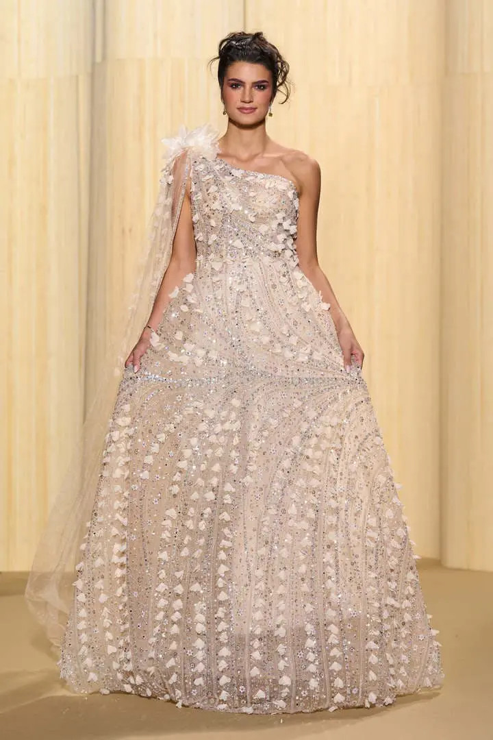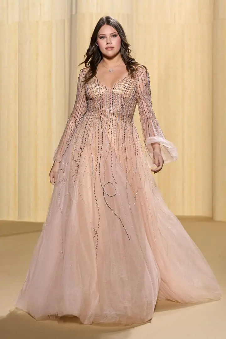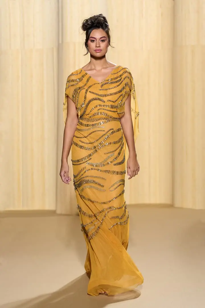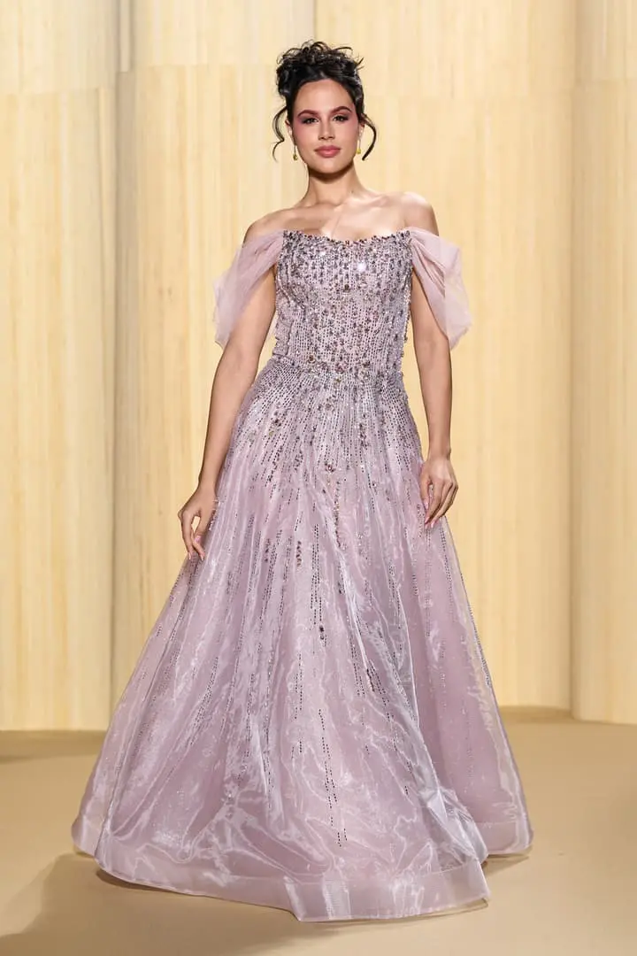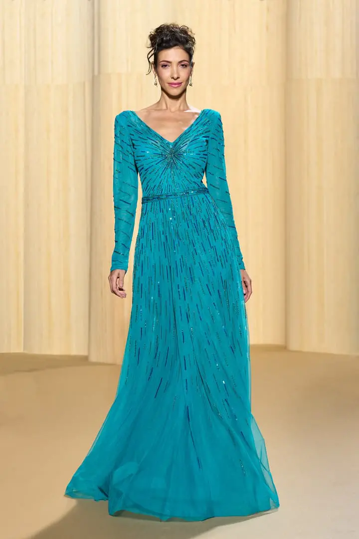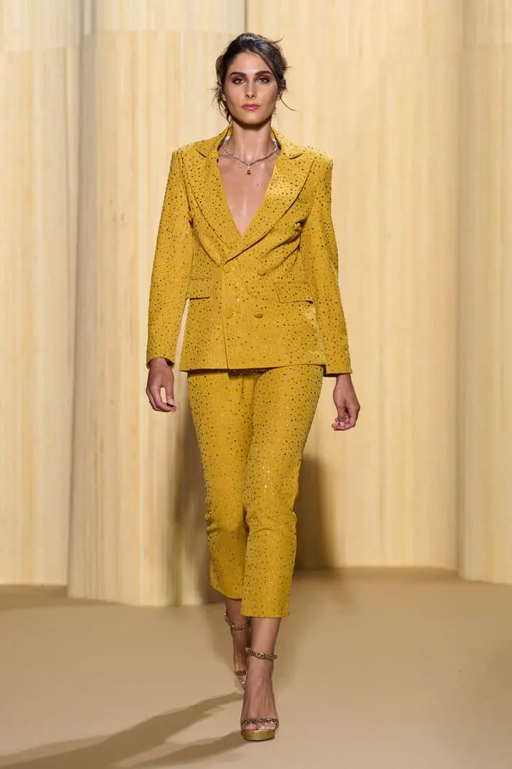 Christophe propose des silhouettes affirmées 80’s, veste iconique du film au col rebrodé, jupons de tulle à volants déstructurés dans des coloris vitaminés de mauve, jaune ou rouge, robes esprit collage en jersey micro-pailleté. Tons de bleu du turquoise au bleu ciel et pétrole pour une intriguante de la nuit. Des looks débridés tendance premiers clips de MTV.